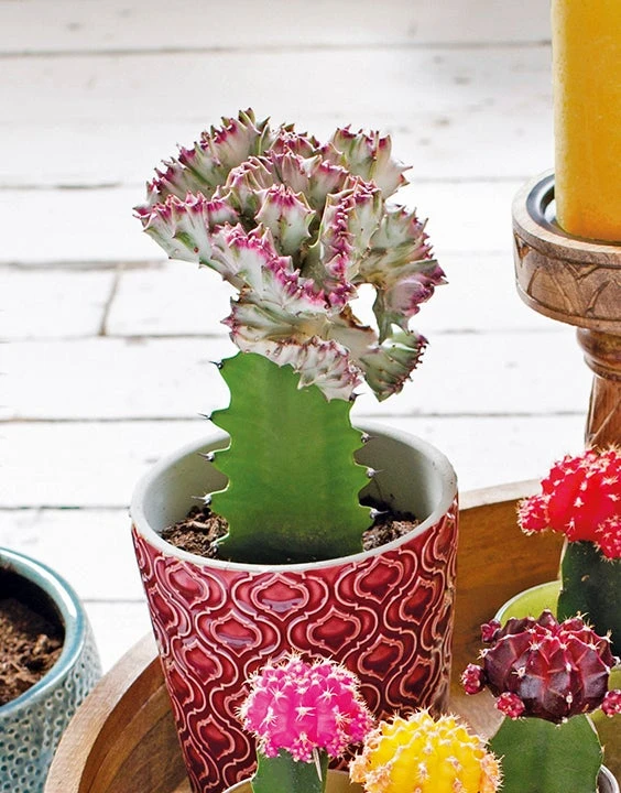 Wil jij een echte eye-catcher in je interieur? Ga dan voor deze bijzondere cactus. Hij heeft namelijk een gekrulde kuif bovenop! De randjes van de kuif zijn roze. Deze Euphorbia Lactea Cristaat hoort op een warme plek te staan en mag wat vaker water dan een gewone cactus. De hoogte van deze cactus is 30 cm en de potmaat is 12 cm.