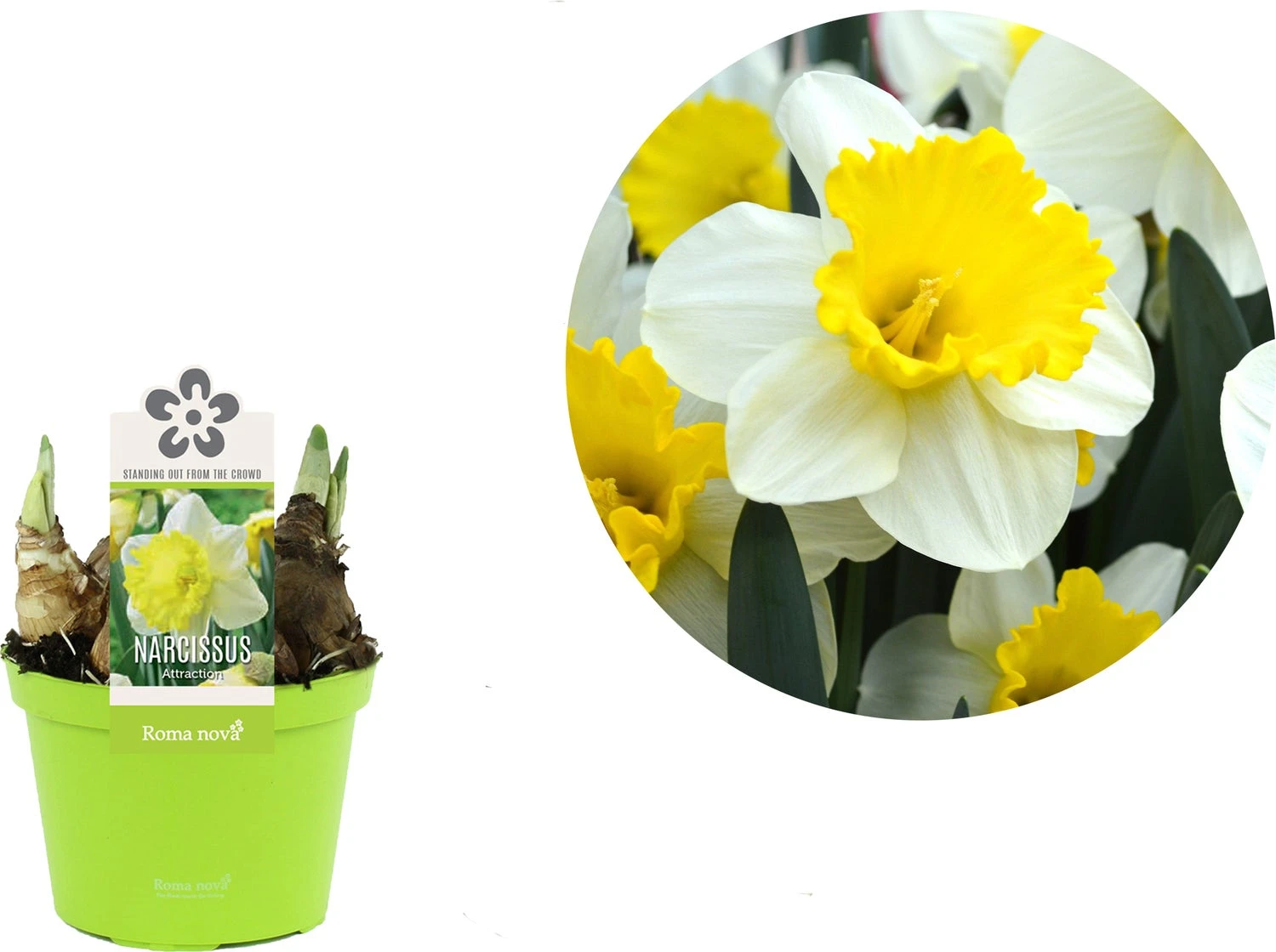 Het is een winterhard bolgewas met opvallende grote gele bloemen. De Narcis is een makkelijk herkenbare lentebloeier. Met zijn volgele kleur geeft hij aan dat de lente weer is begonnen. Hij staat niet alleen erg mooi in de tuin, het terras of op het balkon, maar staat ook erg mooi binnenshuis. Sterke planten die je ook in de tuin kan planten na de bloei. Dit soort bloeit geel wit en is een grootbloeiend soort.