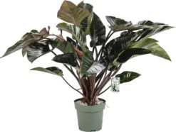 De familie van de Philodendron breidt maar uit en uit. Er zijn tegenwoordig vele soorten en varianten op de markt. De plant is familie van de aronskelkachtigen. De plant komt niet snel in bloei maar dan zie je pas de vergelijking met andere soorten binnen deze grote familie. Het sap van deze plant is giftig voor mens en dieren. Zorg ervoor dat je handschoenen aan doet als je met deze plant aan de slag gaat en zorg ervoor dat hij buiten bereik staat van huisdieren. Deze Philodendron ‘Red Beauty’ heeft rood/groene langwerpig blad.